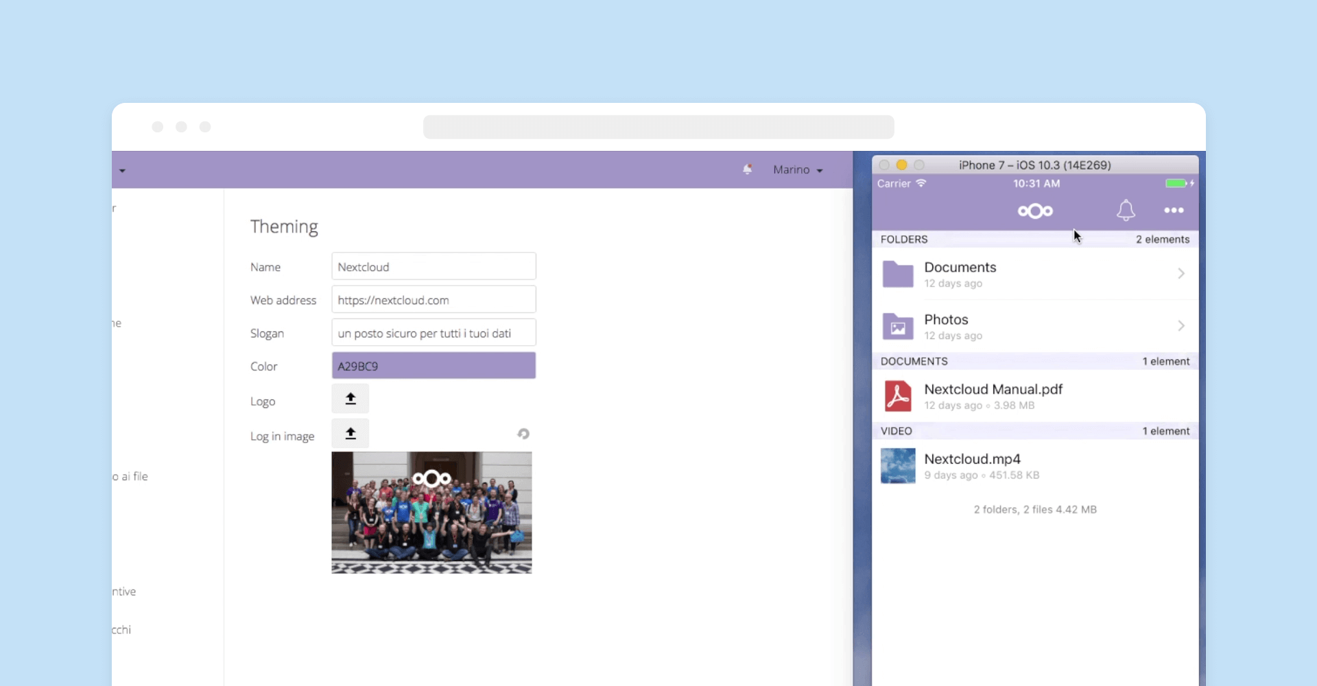 In order to provide a strong enterprise user experience, Nextcloud offers theming and branding capabilities for both servers and clients. The theming and branding can be distributed using our deployment options for both desktop and mobile platforms.